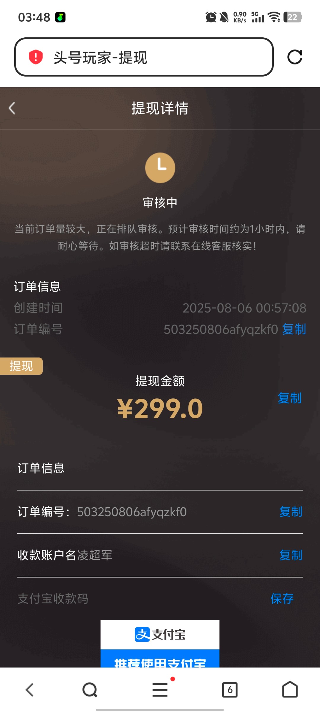 额 头号玩家审核确实慢 一般不黑款 我用28彩金打到388提了审核了3个多小时 然后有电话回访回访完秒了