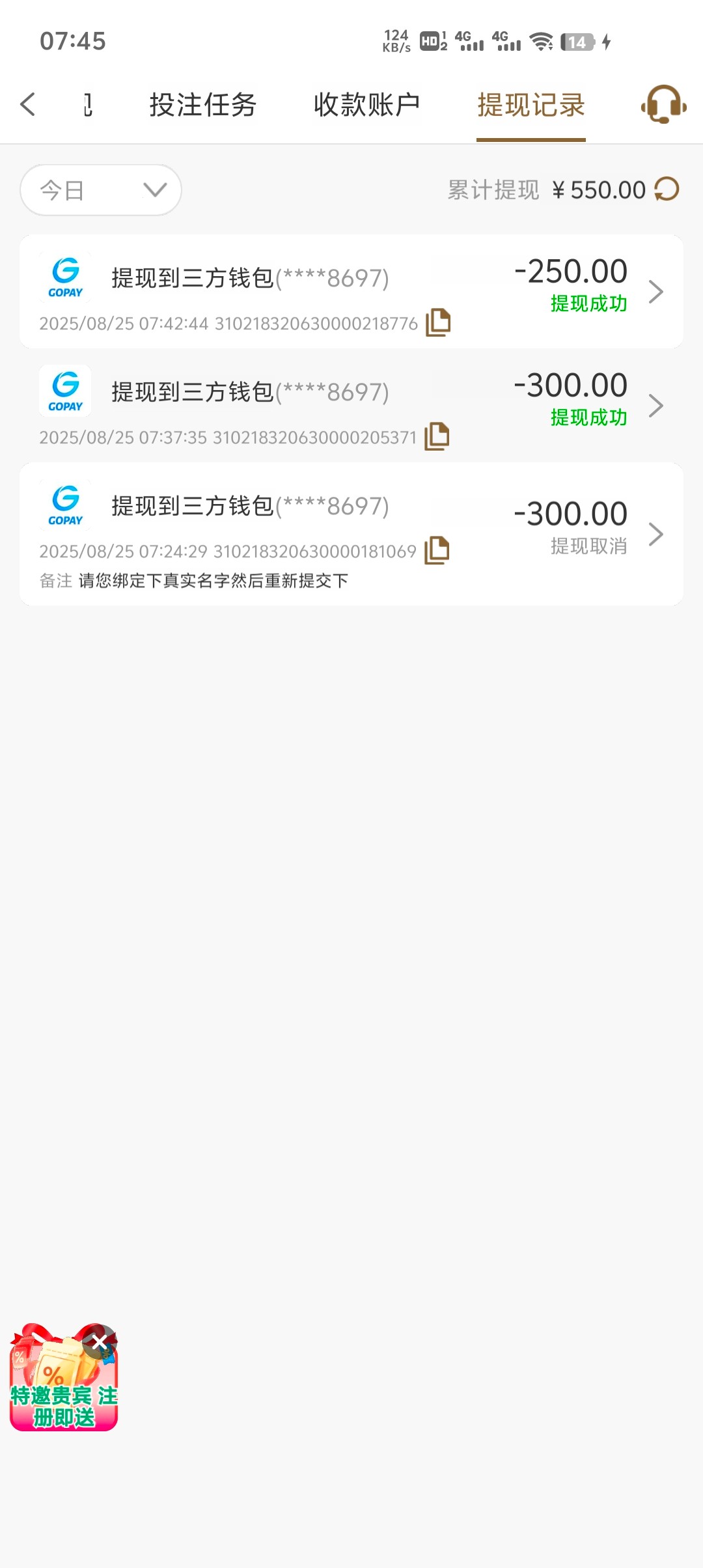 昨天特邀电话,注册登录,自动给了14,然后麻将1,0.4-0.8-1的干上俩百。提现搜帖子发现有人开始黑了,冲的人多。就没充。刚刚无聊,跑去充了50,拉麻将1,给了2次胡上300+,干3/4/6/10空的厉害掉100跑去真人。回300就提,然后拒绝提现,让实名绑卡,绑卡发现以前注册过。想着没戏了,然后领了优惠,才反应过来再试试提现,结果差十几块码钱,干麻1,卡4和3卡胡,果断改2进免费爆了160多倍,余额上500+就提了300,5分钟到账,马上又提250。留了20慢慢磨