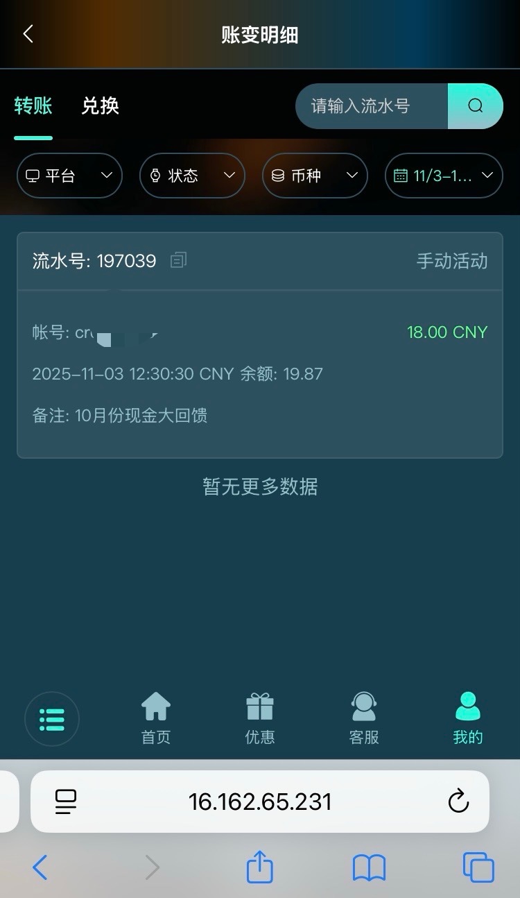 幻影收到10月份现金回馈彩金,有号的去看看。