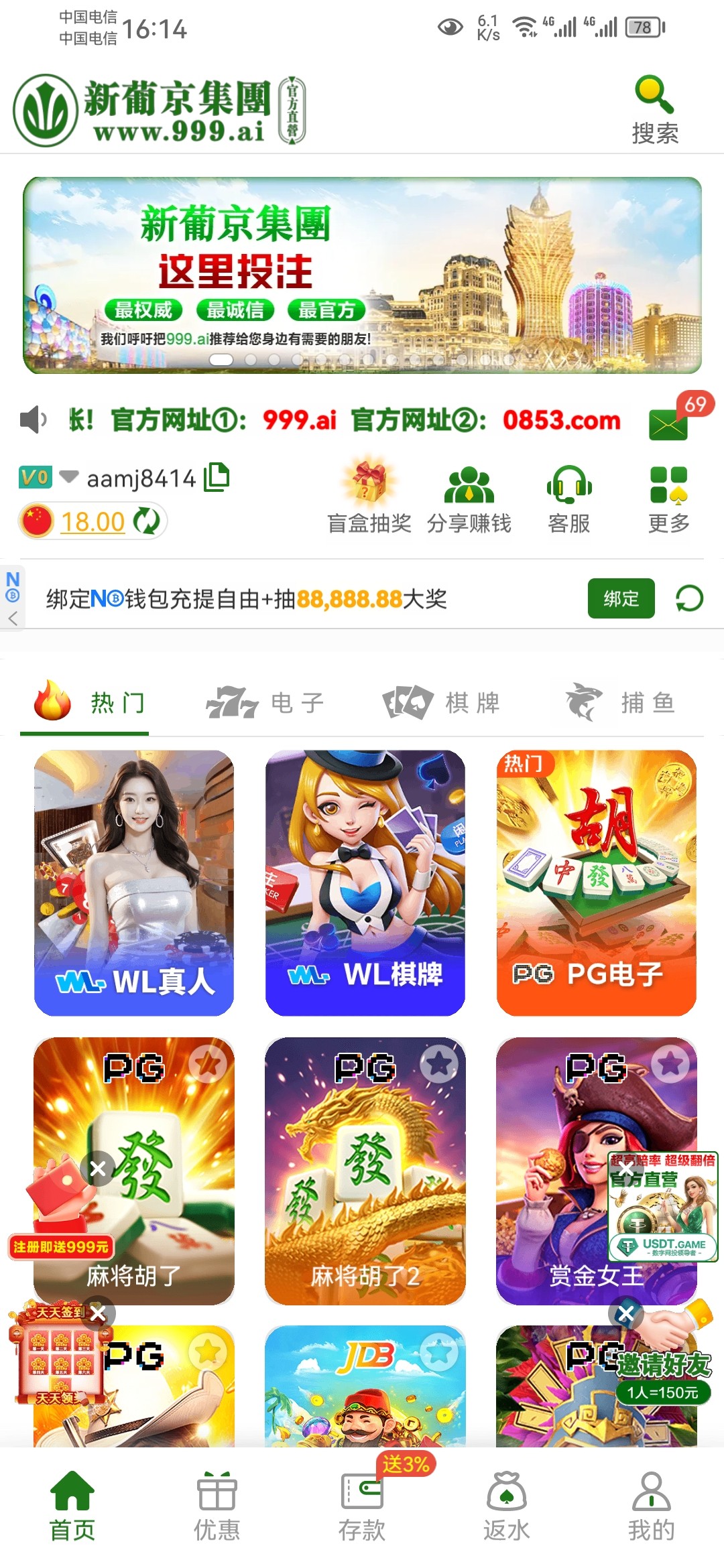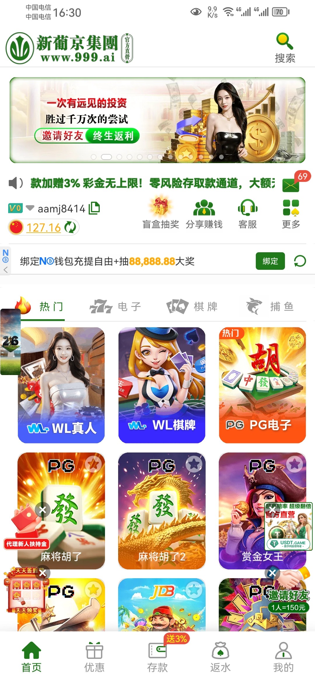 这个台子玩过还是挺牛逼的白嫖差不多两百,不要充值。我充值玩了差不多倒贴300,靠着反利赢回来了再也没充值