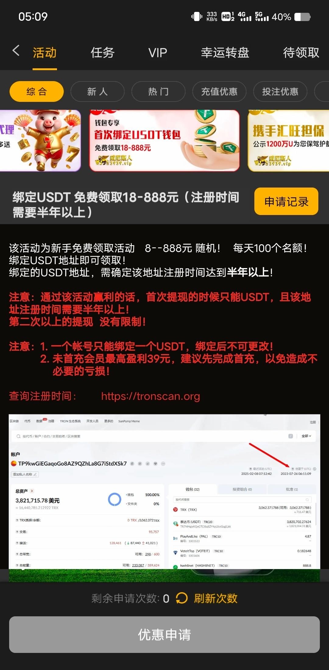 链接3939.com 绑定半年u地址送18 短信里面翻到的,下载 app 在活动里面申请,我几分钟就给了 没打出来,祝老哥们成功申请撸爆狗庄